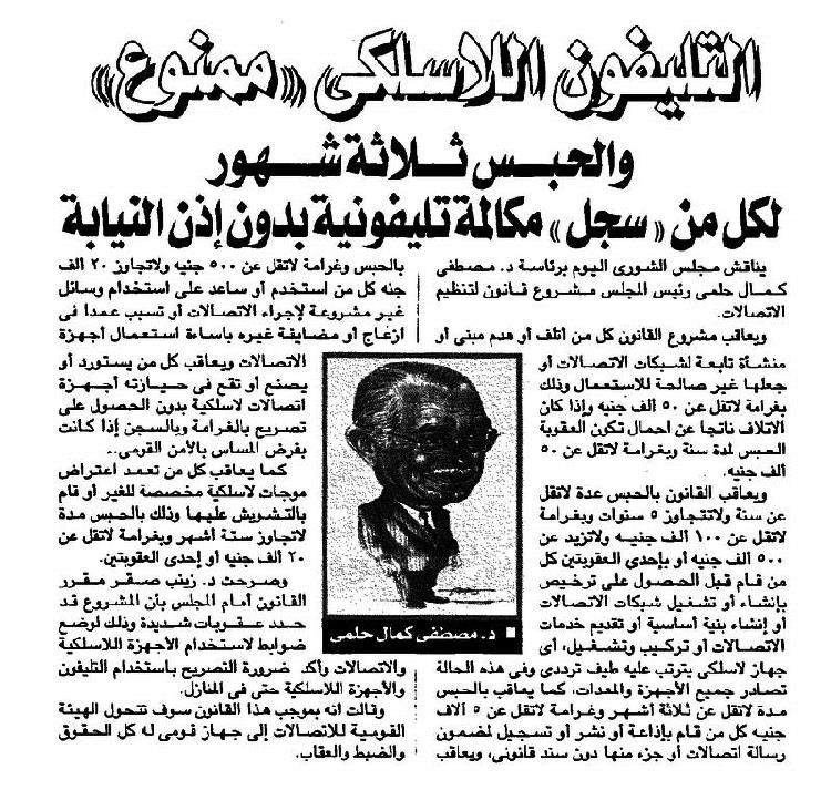 لكن التحول الاقتصادي لم ينهِ هاجس السيطرة. ففي نوفمبر 2002، أبرزت صحيفة "أخبار اليوم" ملامح مشروع قانونٍ للاتصالات كان مطروحاً للنقاش في مجلس الشورى (غرفة البرلمان الثانية آنذاك) تحت عنوانٍ لافت: "اللاسلكي ممنوع". تضمّن المشروع حظر استخدام الهواتف اللاسلكية بلا ترخيص ومصادرة الأجهزة المخالفة وتخويل السلطات حقّ مراقبة المكالمات عند الضرورة الأمنية وإلزام شركات الاتصالات بتوفير البنية الفنية اللازمة لذلك. هكذا سعت الدولة إلى إحكام الإطار القانوني الذي ينظم الاتصال المنزلي وتطويق أيّ أنماط تواصلٍ تتوسع خارج نطاق الرقابة، حتى في لحظة الانفتاح الاقتصادي وتحرير السوق.