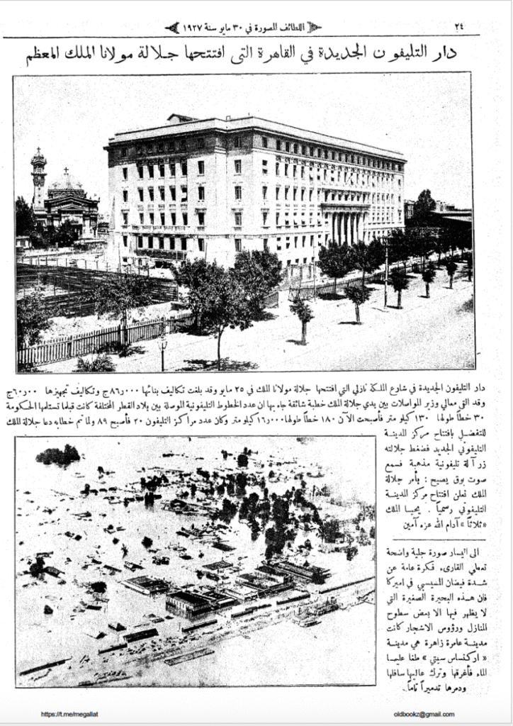 وفي مايو 1927، بلغت التحديثات ذروتها مع تدشين مبنى السنترال الجديد في قلب القاهرة، بحسب ما وثّقته مجلة اللطائف المصورة في تقريرٍ موسعٍ تصدّره عنوانٌ عريض: "واجهة دار التليفون الجديدة بالقاهرة". وأشارت اللطائف، وهي من أوائل المجلات المصورة في مصر، إلى أن المبنى صُمِّم ليكون مقراً مركزياً لإدارة الاتصالات. وفي الافتتاح أجرى الملك فؤاد أول مكالمةٍ رسميةٍ من داخل المبنى مستخدماً سماعةً مطليةً بالفضة. وكشفت المجلة أن "دار التليفون الجديدة" ضمّت وحدة بطاريةٍ مشتركةً طاقتُها الاستيعابية تقارب ستة آلاف خطٍّ، ما جعلها من أضخم المشروعات في عهد الملكية. إذ حلّ هذا المبنى محلّ السنترال اليدوي القديم، ووفّر نظاماً آليّاً يتيح للمشتركين الاتصال من دون تدخّلٍ مباشرٍ من الموظفين، وهو النظام الذي كان معمولاً به في الأنظمة اليدوية القديمة.