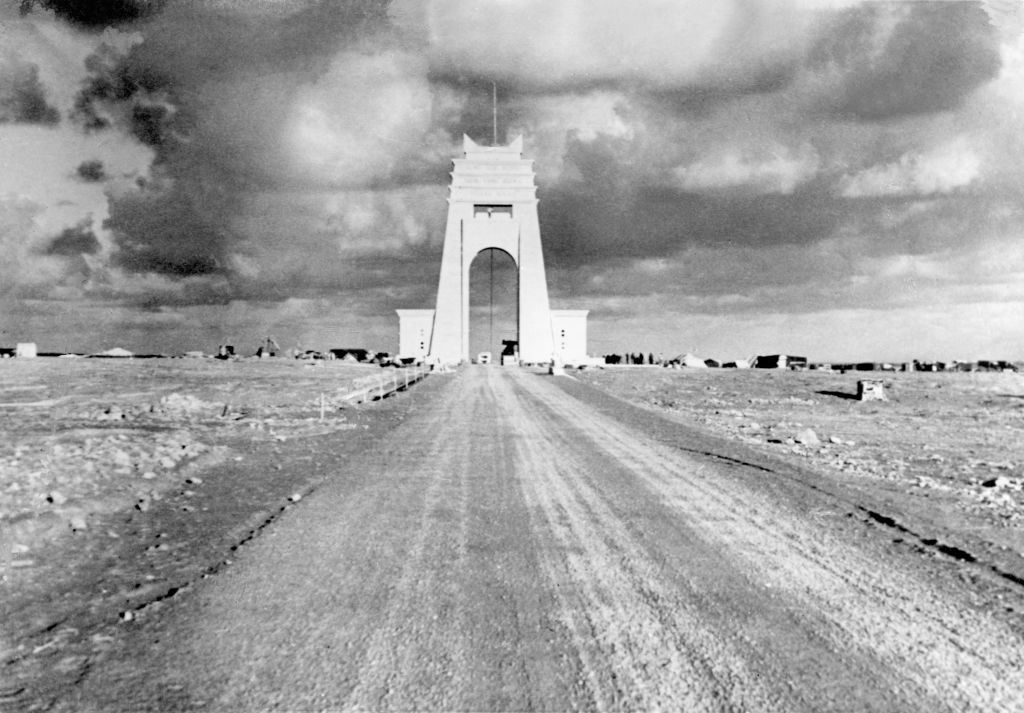 هناك بالتحديد أراد بالبو بصم توقيعه على المشروع. حرص على القول في خُطبه أن الرومان أنفسهم لم يجرؤوا على وصل خليج سرت بطريقٍ معبّد، وأن إيطاليا أنجزت ما عجزت عنه الإمبراطورية القديمة. لهذا ليس غريباً أن يختار منتصف الطريق، حيث تحيل الخرائط القديمة لموقع مذبح الأخوَيْن فيلّيني، لبناء قوس نصرٍ يختصر المشروع في نصبٍ واحد. كان هذا النصب ذروةَ الطريقِ الرمزيةَ واستدعاءً لأسطورةٍ قديمةٍ تكرّس سيادةً جديدةً، وجعلت الأسفلت والبرونز وحجارة الترافرتين الجيرية امتداداً "للعدل الروماني" كما صورته الدعاية الفاشية. هكذا ظهر قوس الأخوين فيلّيني لتحويل منتصف الطريق الجديد إلى مسرحٍ أسطوري.
